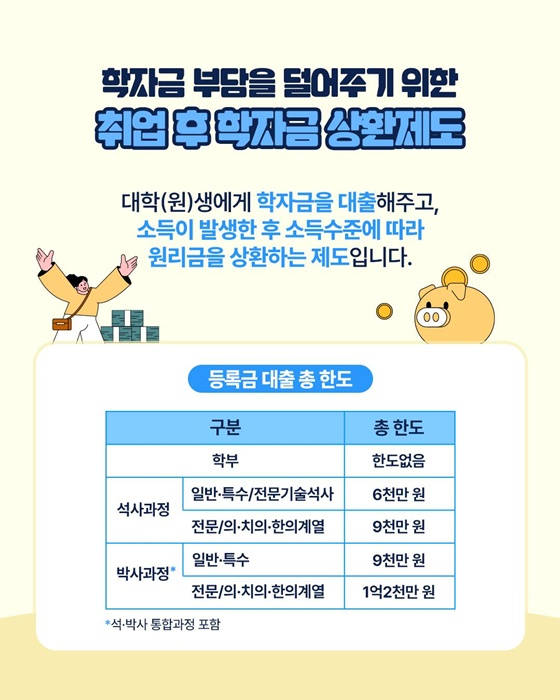 학생 입장에서는 복잡한 절차 없이 학업에 전념할 수 있고, 소득이 생긴 후 상환을 시작하니 미래에 대한 부담도 줄어드는 장점이 있습니다.