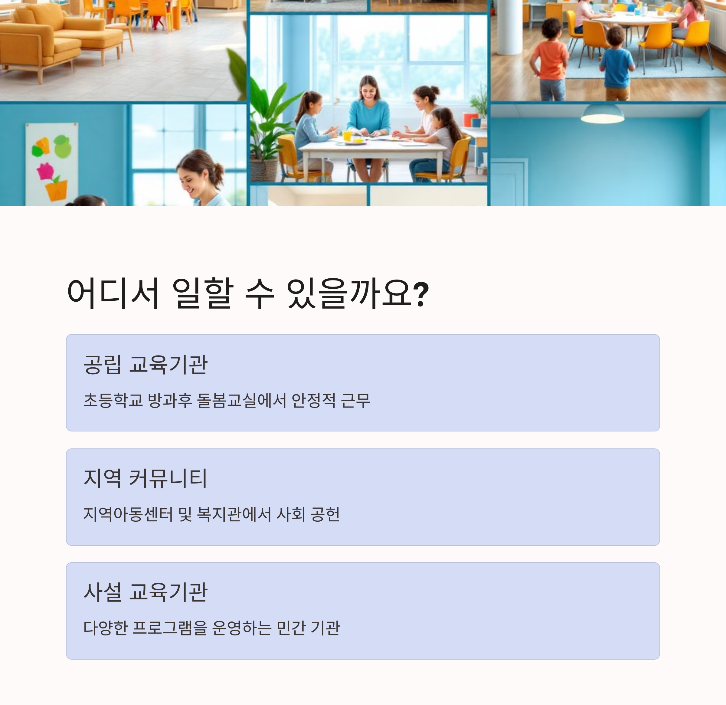 - 초등 돌봄교실, 복지관, 지역아동센터 등 다양한 기관 취업 가능