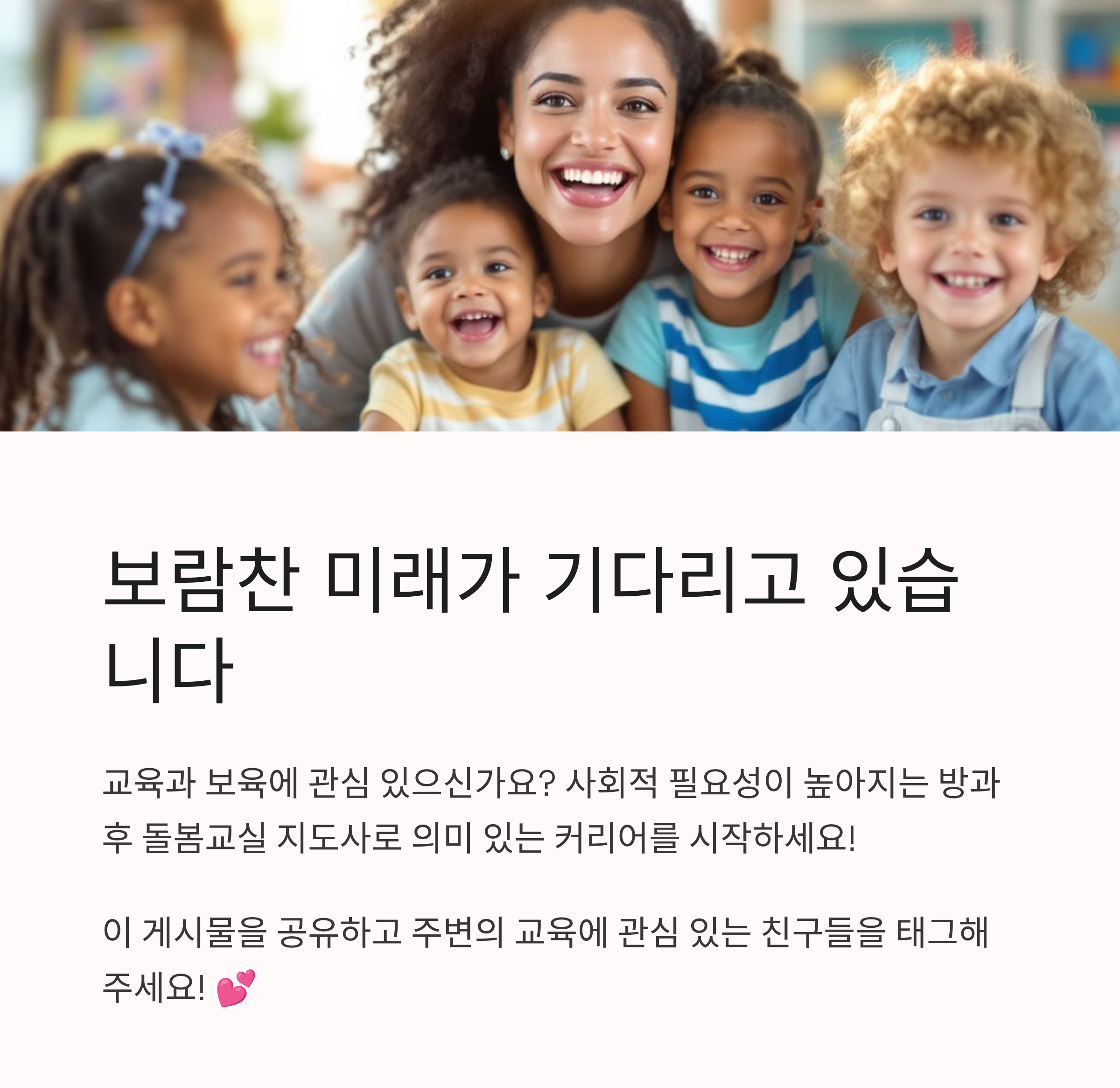아이들을 사랑하고, 교육에 관심이 있는 분들이라면 방과후 돌봄교실 지도사로의 도전을 적극 추천드립니다. 자격증 취득 과정을 거쳐 전문성을 갖춘다면, 초등학교 돌봄교실부터 지역아동센터, 사설 교육기관까지 다양한 곳에서 일할 수 있는 기회가 열려 있습니다.